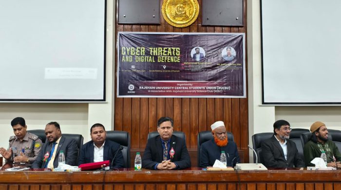সাইবার অপরাধ, অনলাইন প্রতারণা, ডিজিটাল হুমকি এবং ব্যক্তিগত তথ্যের সুরক্ষা বিষয়ে শিক্ষার্থীদের বাস্তবভিত্তিক, সময়োপযোগী ও কার্যকর ধারণা প্রদানের লক্ষ্যে রাজশাহী বিশ্ববিদ্যালয়ে (রাবি) ‘সাইবার থ্রেটস অ্যান্ড ডিজিটাল ডিফেন্স’ শীর্ষক কর্মশালা অনুষ্ঠিত